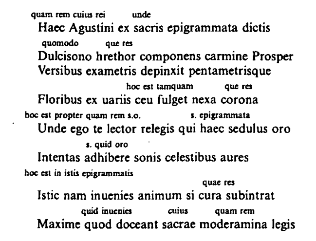 Here is a transcription of circumstantiae glosses to Prosper’s Epigrammata in in Cambridge, Trinity College, MS O.2.31, transcribed by Carin Ruff in “Misunderstood Rhetorico-Syntactical Glosses in Two Anglo-Saxon Manuscripts.” Notes and Queries (June 1998): 163-166, at p. 163: