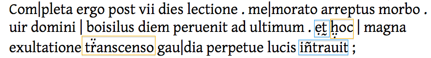 In the next example, above-and-below dot-stroke boundary glosses pick out et at the beginning of the clause and the verb intrauit at the end (marked in blue here), while above-and-below triple dots link the members of an ablative absolute (marked in orange). Whether the glosses on hoc…transcenso are better understood as boundary glosses, marking the limits of a syntactical unit, or linking glosses, identifying a pronoun and the participle that agrees with it, is a matter for investigation.