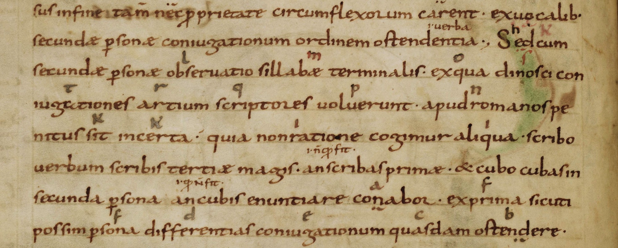 This detail from a 9th-century Breton copy of the grammarian Eutyches in Oxford, Bodleian Library, MS Auct. F.4.32, fol. 2v (“St. Dunstan’s Classbook”) shows paving letters used (with only partial success) to elucidate a long sentence: